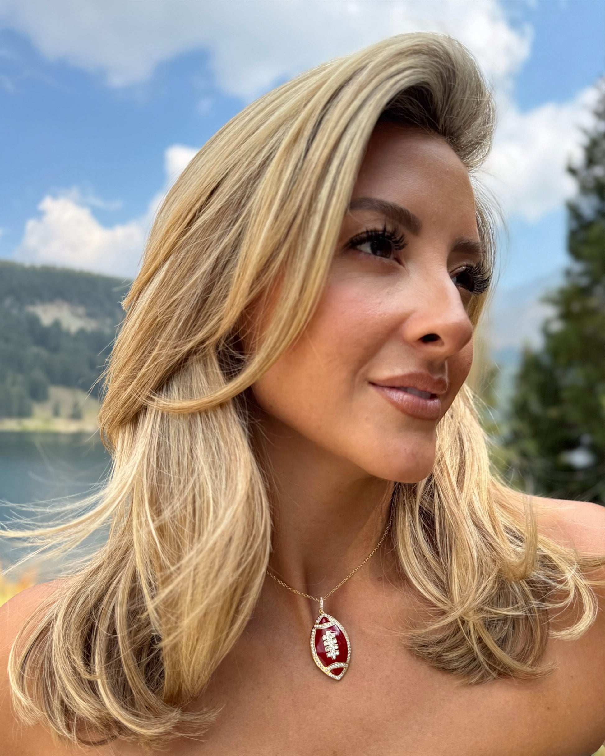 Make a bold statement with this large, eye-catching football necklace! Covered in dazzling crimson enamel and gold rhinestone detailing, it’s the ultimate sparkly accessory for game-day glam.