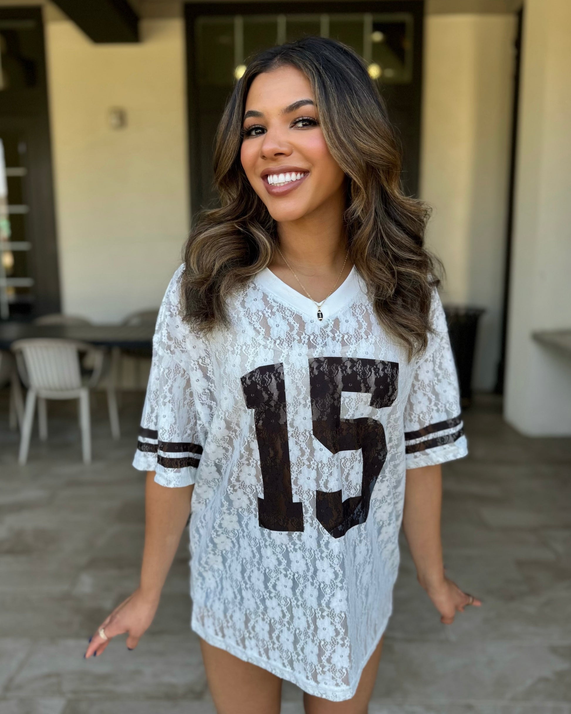 Make a bold statement on game day with this oversized sheer lace football jersey! Designed with classic sleeve stripes and #15 on the front, this white-and-black piece layers perfectly over a bralette, bra, or tank for a sporty-chic look that’s full of team spirit.